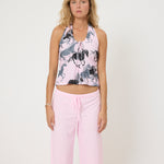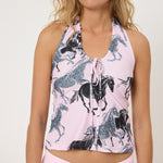 Inspired by the spirit of rodeo, the Wendy Top form the RODEO collection showcases a playful horse print with a soft pink Baun color. The halter silhouette is finished with a front drawstring detail for a flattering, adjustable fit.