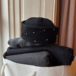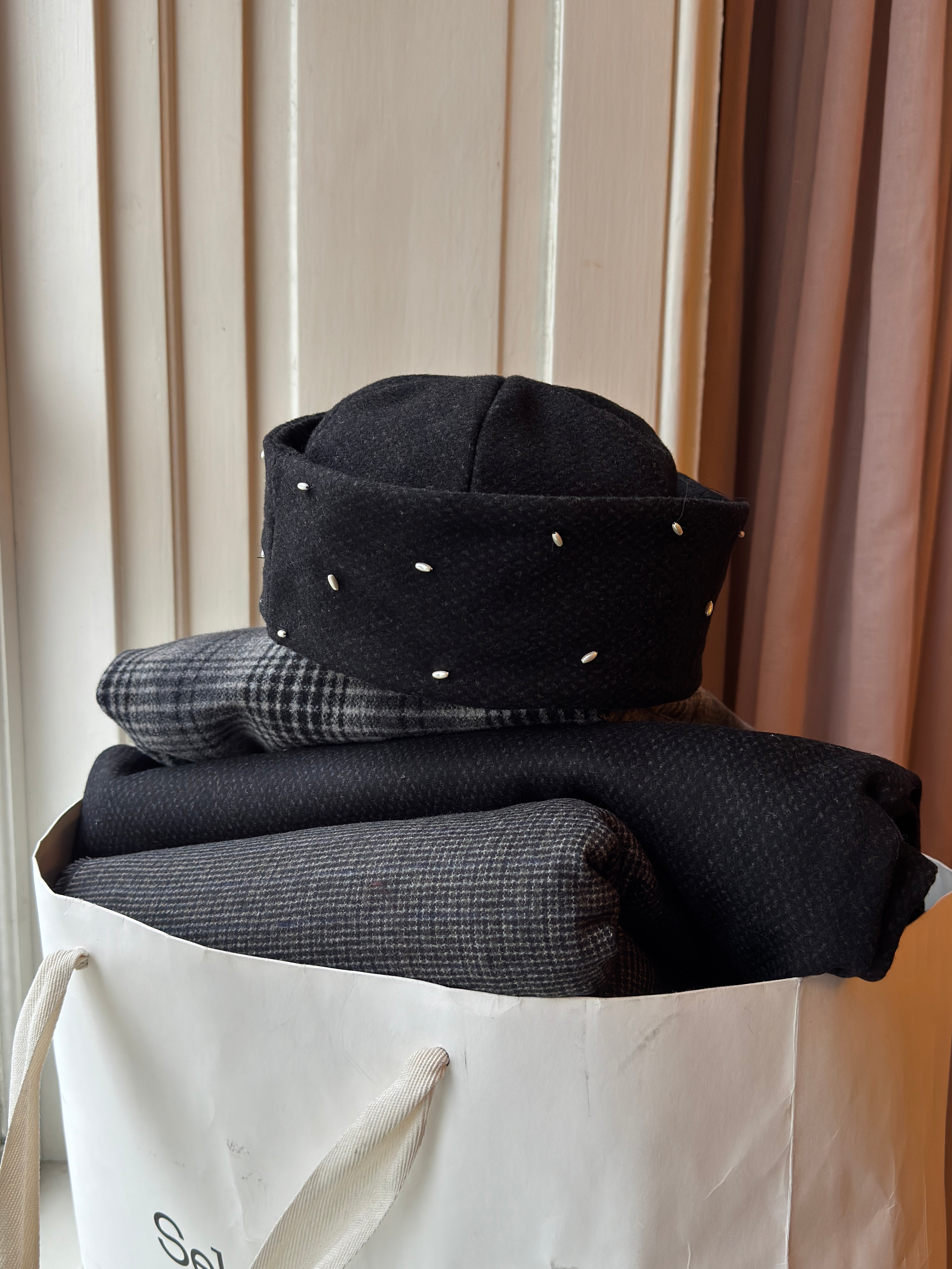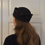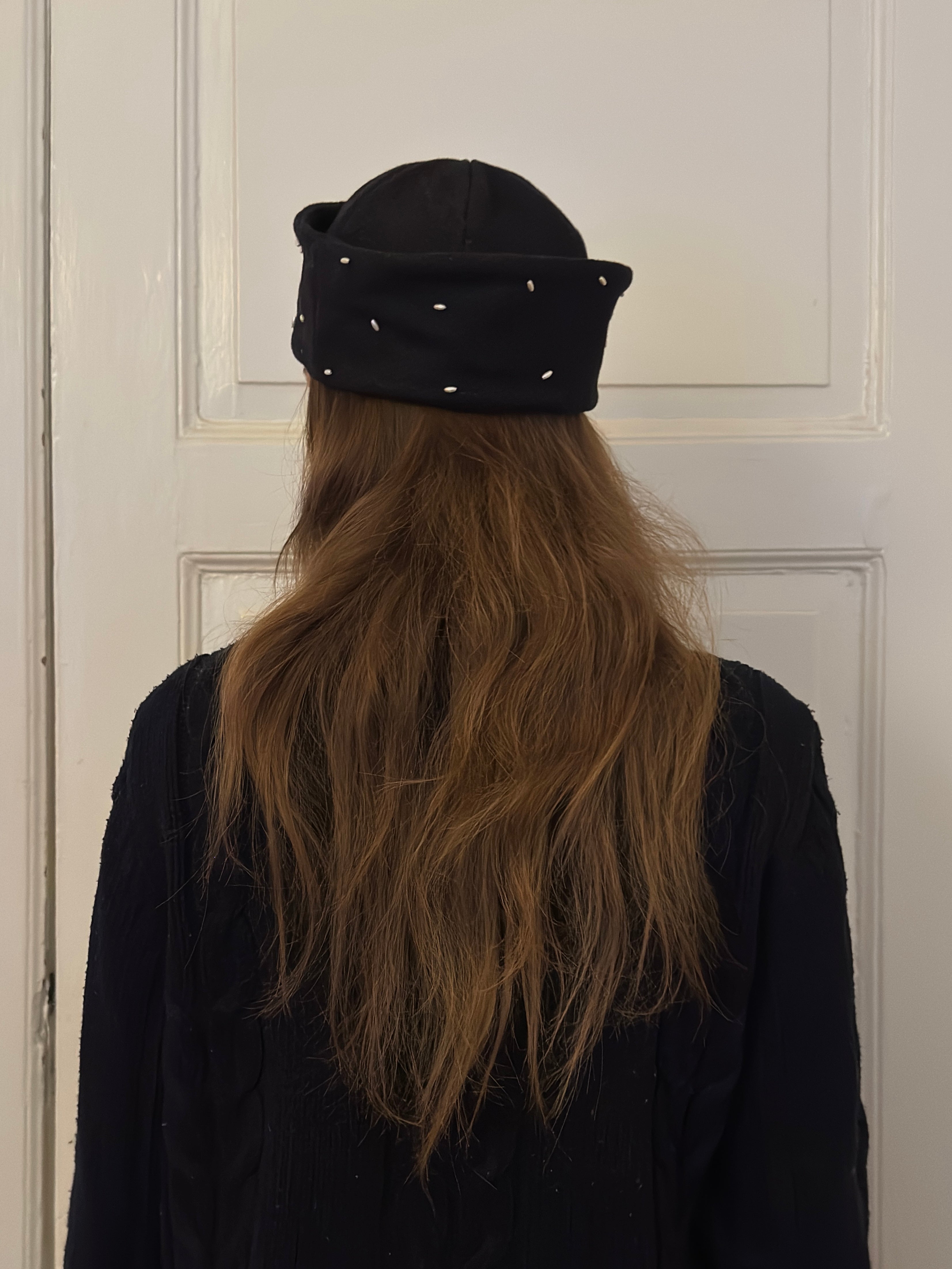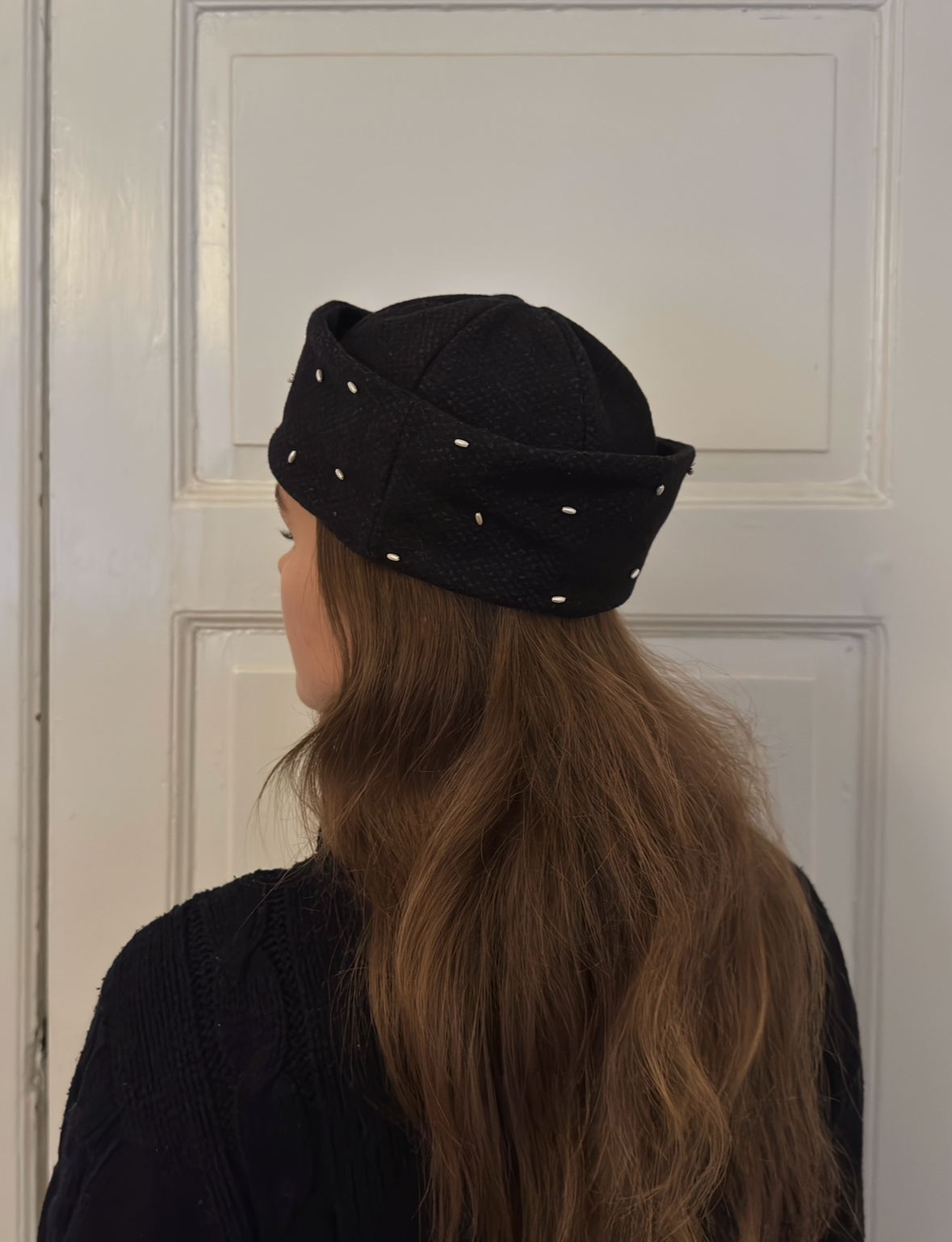 Sailor hat in a soft wool blend made from deadstock material, made with white pearls on the sides. Sewn in Copenhagen. Designed with a modern fit and everyday comfort in mind. Made for cold winter days in the city. The black version has a minimal, timeless look that works just as well with casual outfits as more refined styles.