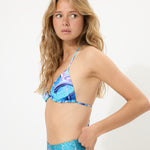 Luna bikini top with cute blue swirl print, inspired by the movement from the ocean. Adjustable ties in the back and neck. Double layer fabric