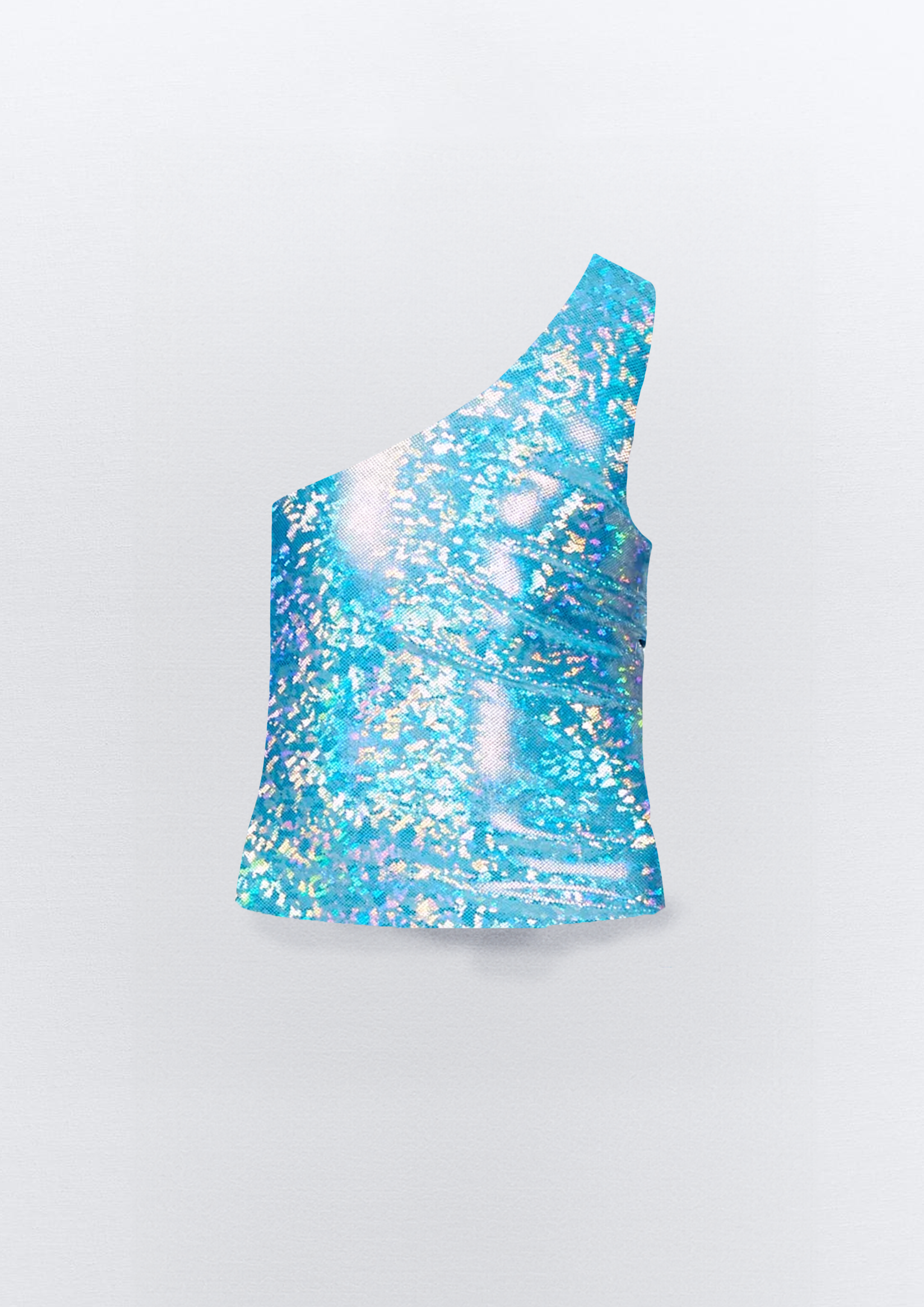 Our signature one shoulder top in blue with silver hologram foil. A showstopper at all event.