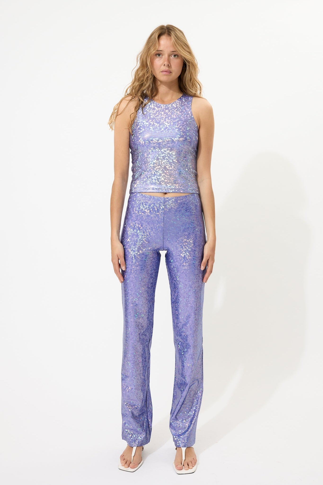 Our classic tank top in purple with silver glitter foil. The perfect statement top for your wardrobe that makes you stand out from the crowd