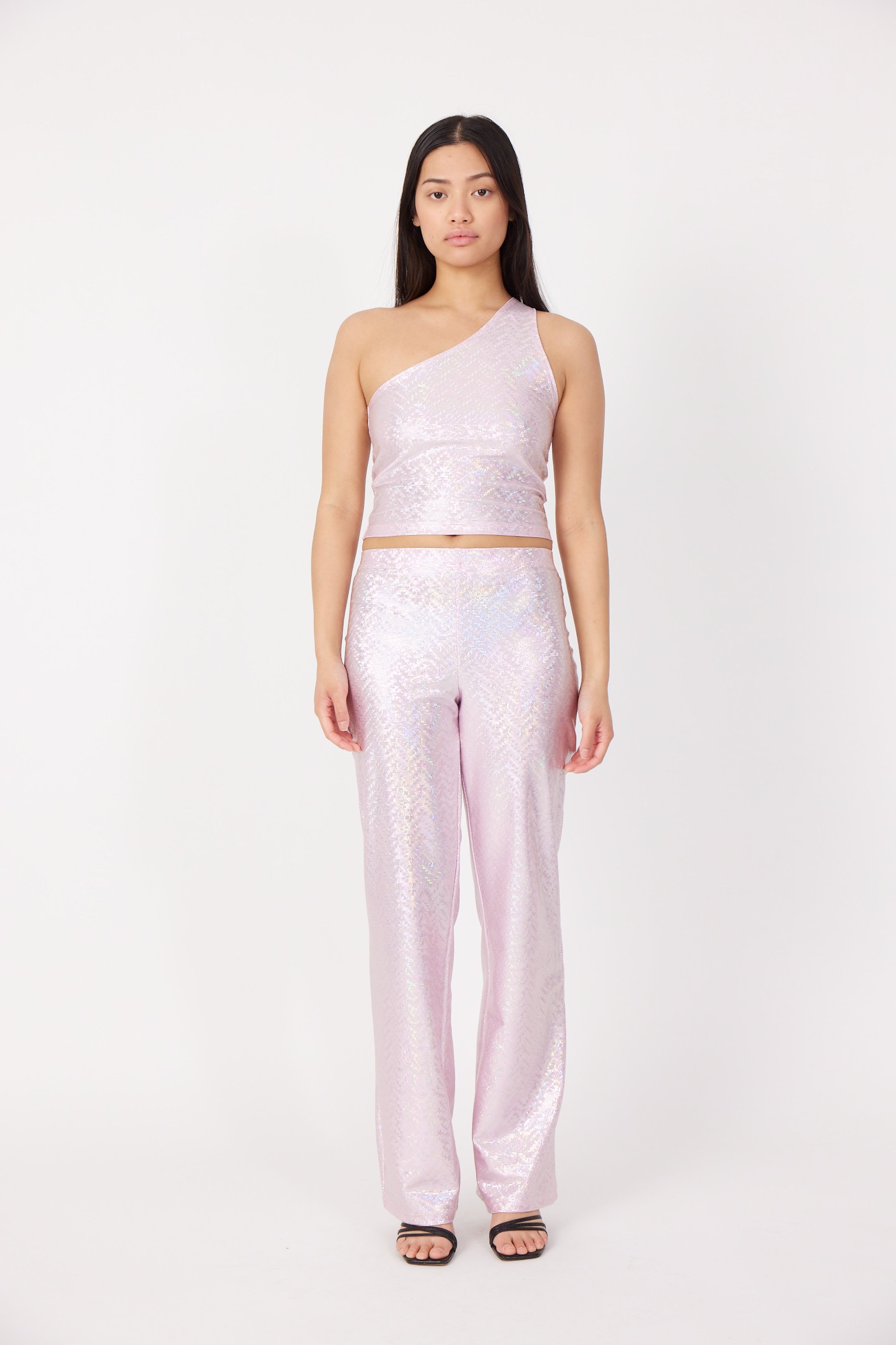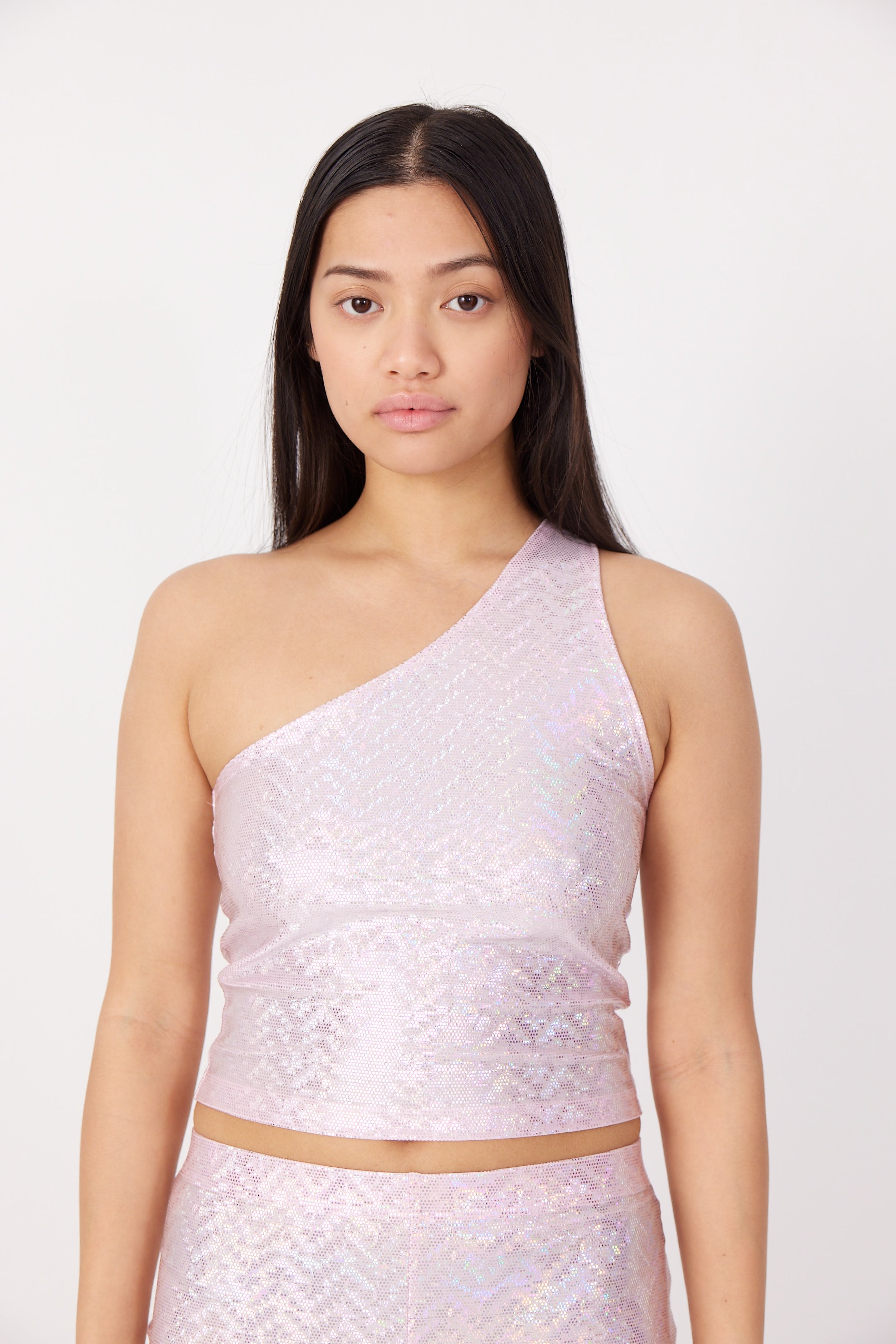 Our signature one shoulder top in rose with silver hologram foil. A showstopper at all event.