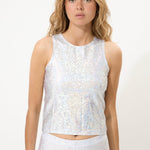 Our classic tank top in white with silver glitter foil. The perfect statement top for your wardrobe that makes you stand out from the crowd