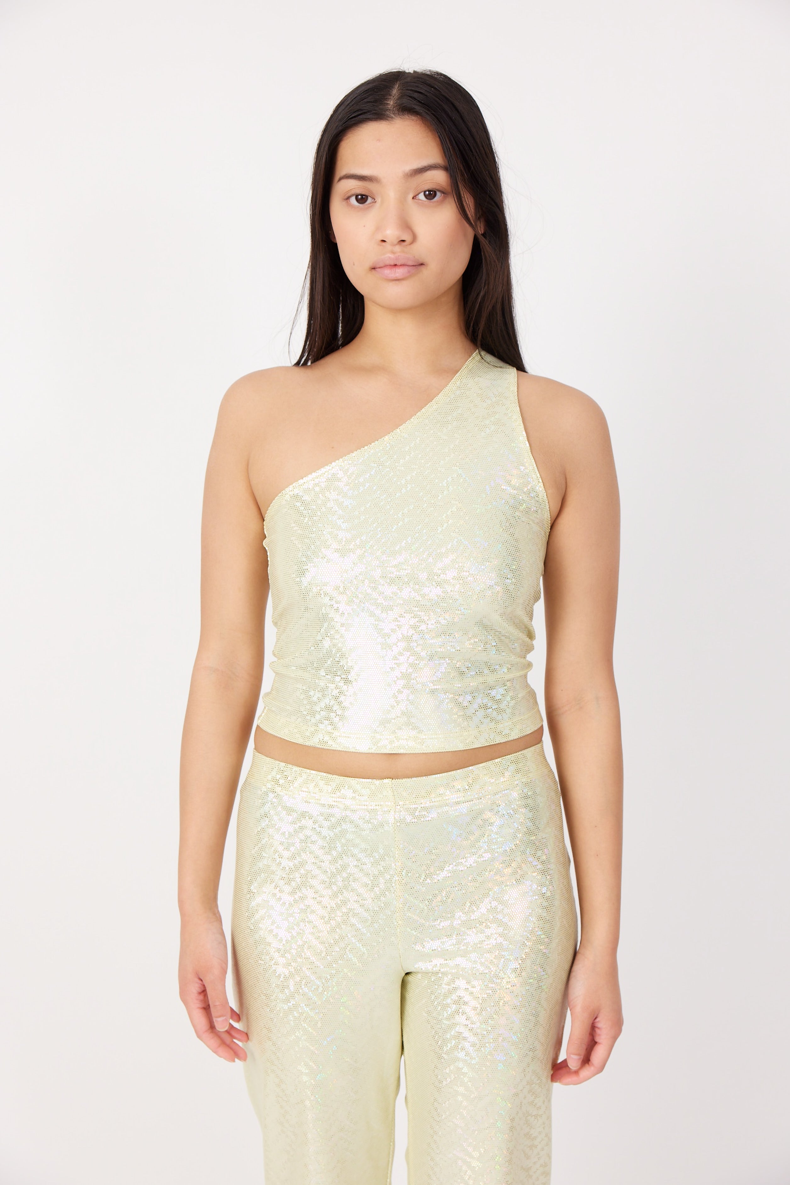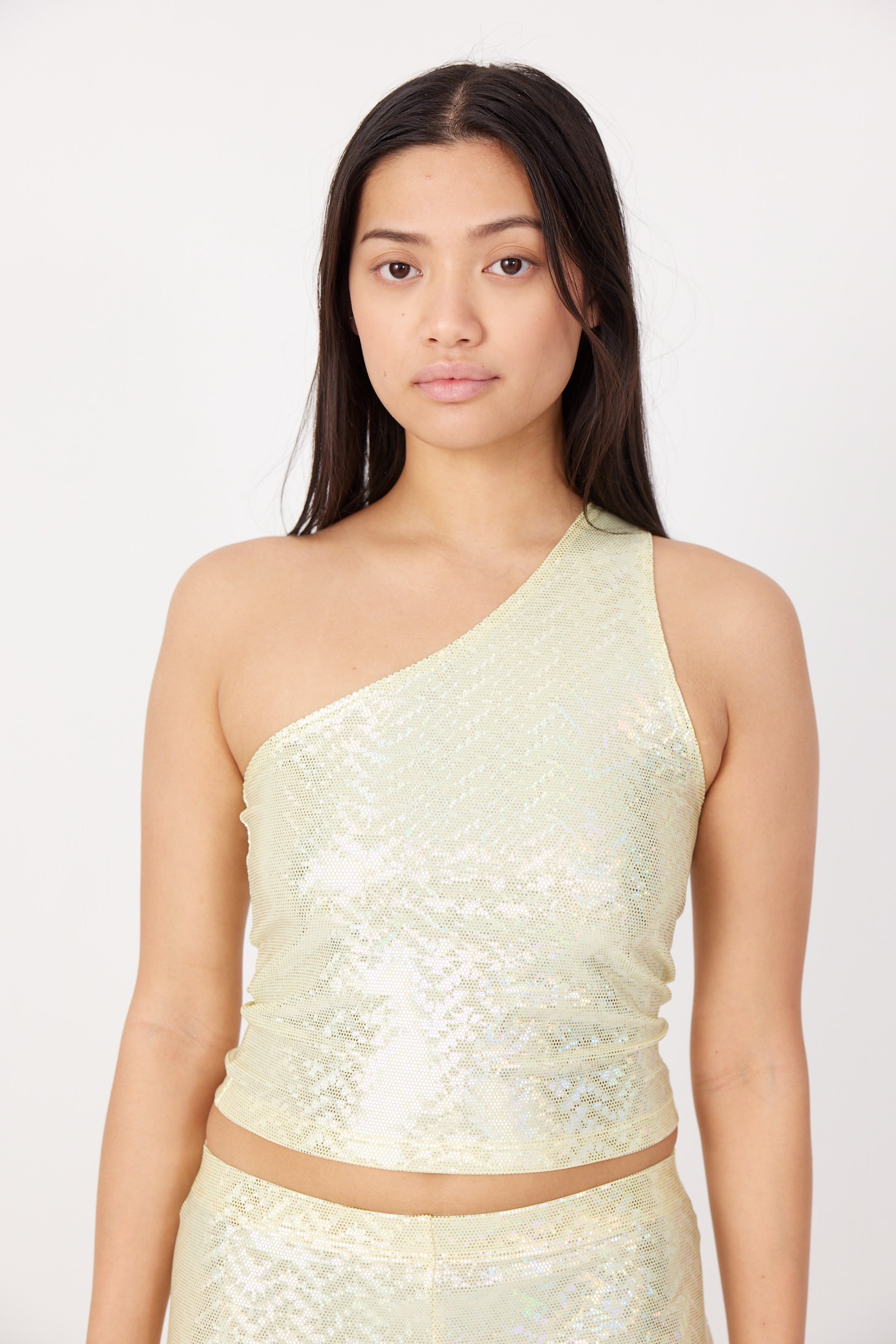 Our signature one shoulder top in yellow with silver hologram foil. A showstopper at all event.