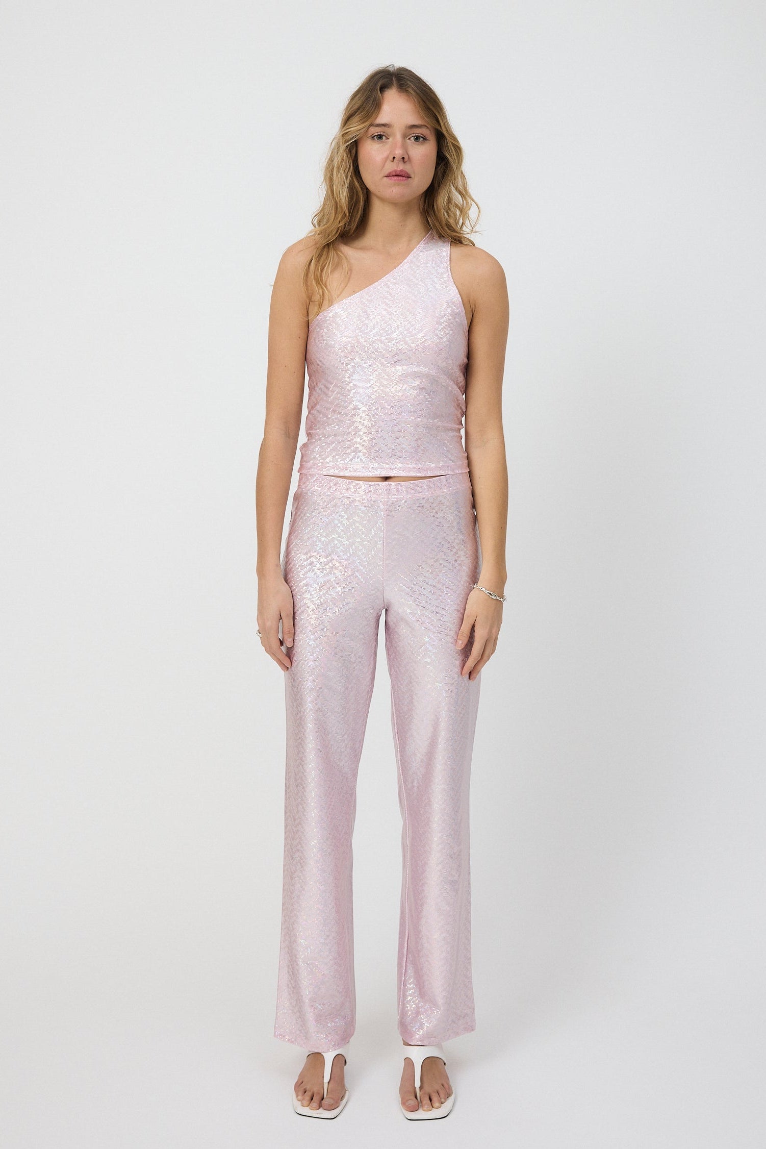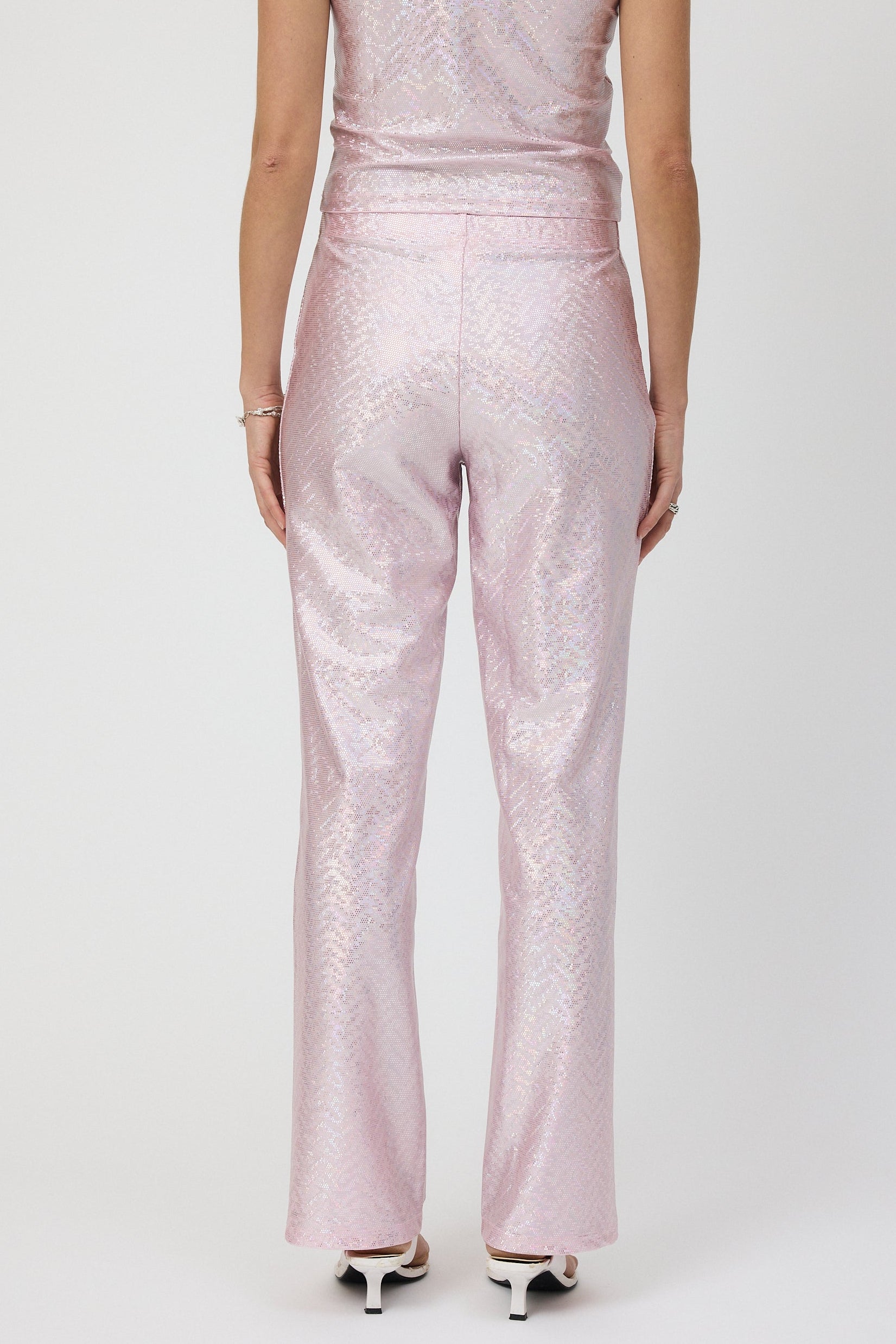 Our sparkling light pink glitter pants with a straight fit and an elastic waist, that sits comfortable on the stomach. The pants have a silver hologram foil that gives it a beautiful shine that makes the room light up, just as you deserve to do!