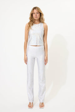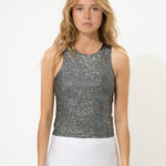 Our signature glitter tank top in the color black. The fabric is foiled with shiny silver hologram foil that can spark up any room you enter