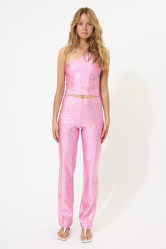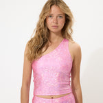 Our signature one shoulder top in pink with silver hologram foil. A showstopper at all event.